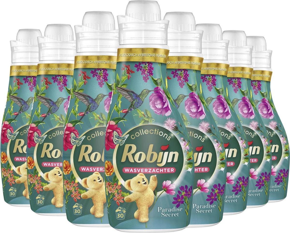 Laat je verrassen door de botanische geur van Robijn Collections Paradise Secret wasverzachter. Robijn heeft de geur van deze Collections wasverzachter verbeterd, zodat je kunt genieten van zacht wasgoed en een nóg betere geurervaring. Het frisse, bloemige parfum van deze wasverzachter is ontworpen door parfumexperts en zorgt voor een nog langer durende frisheid van je wasgoed. Robijn wasverzachter bevat geurcapsules die ervoor zorgen dat je de frisse geur van je wasgoed ook tijdens het dragen blijft ruiken. Met Robijn geniet je dus van extra langdurige frisheid van je wasgoed. De wasverzachter combineert de unieke geur van een beetje glamour met de zachtheid die je van Robijn wasverzachters kent. De wasverzachter zorgt ook voor een speciale beschermlaag rondom de vezels van de stof. Dit zorgt ervoor dat er minder wrijving ontstaat tussen de vezels, met als gevolg dat je kleding zijn kwaliteit behoudt doordat het minder snel slijt en zijn pasvorm en kleuren behoudt. Daarnaast is je kleding makkelijker strijkbaar door de wasverzachter en droogt het sneller. De Robijn Collections Paradise Secret wasverzachter bevat ingrediënten die voor 95% biologisch afbreekbaar zijn. De resterende 5% is om de kwaliteit en veiligheid van het product te garanderen. Hierdoor blijft je kleding heerlijk zacht en zorg je tegelijkertijd beter voor het milieu. Combineer met het bijbehorende Robijn Collections Paradise Secret wasmiddel om zo lang mogelijk te genieten van alle stralende kleuren en heerlijke geuren in je kast.